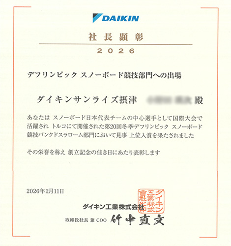 功績をたたえ、ダイキン工業 竹中社長より社長顕彰を受けました。
