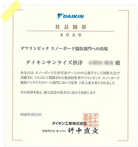 今年は、全ダイキングループで4名が受賞され、そのうちの1名としてOさんが選ばれました。